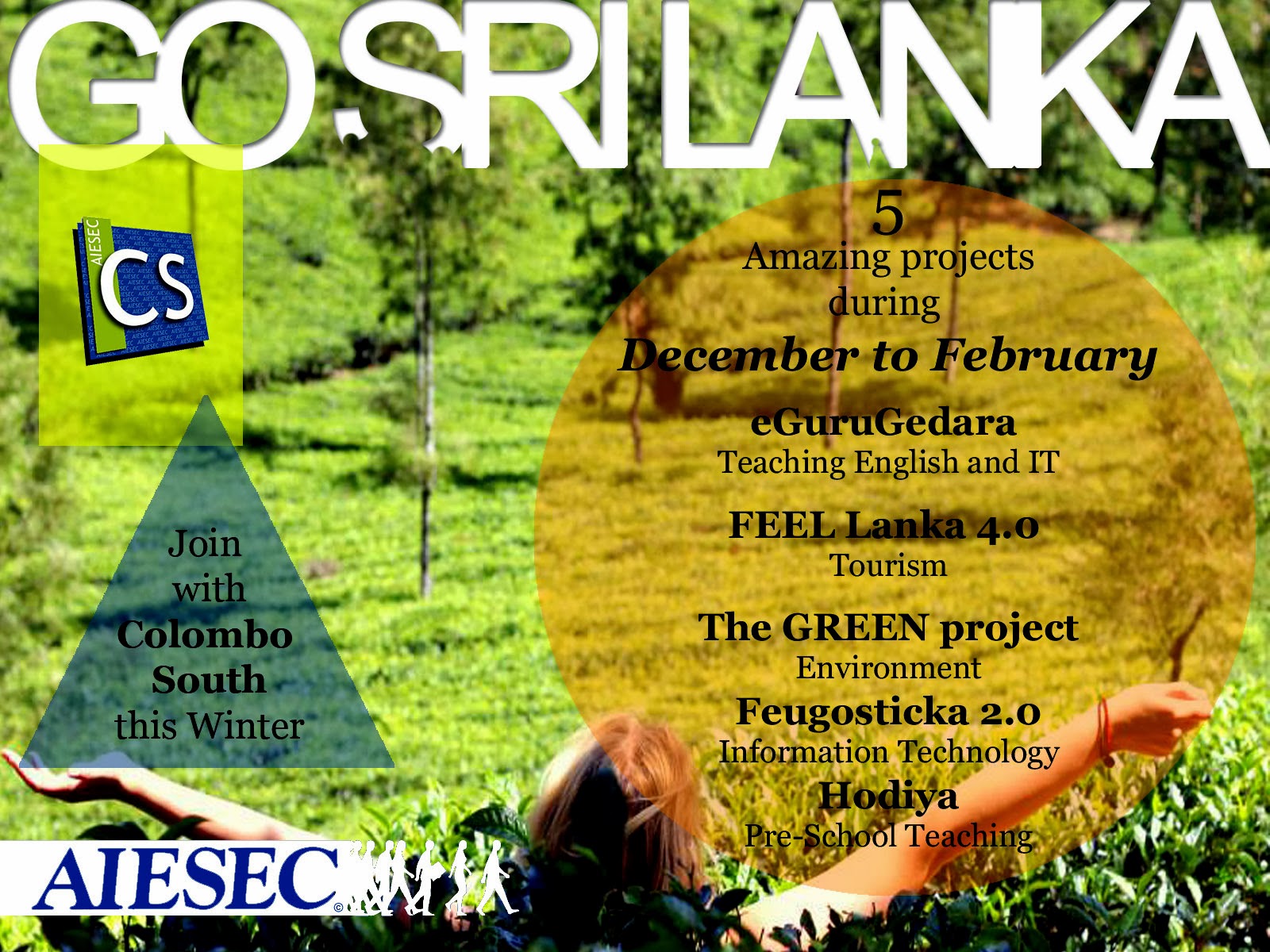 AIESEC Colombo South is hosting 5 amazing projects for coming winter. If you are ready for a life changing experience in paradise , APPLY NOW ! ! ! !